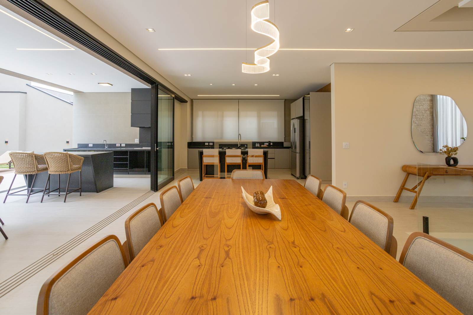 Cozinha com ilha central integrada ao gourmet, também com ilha