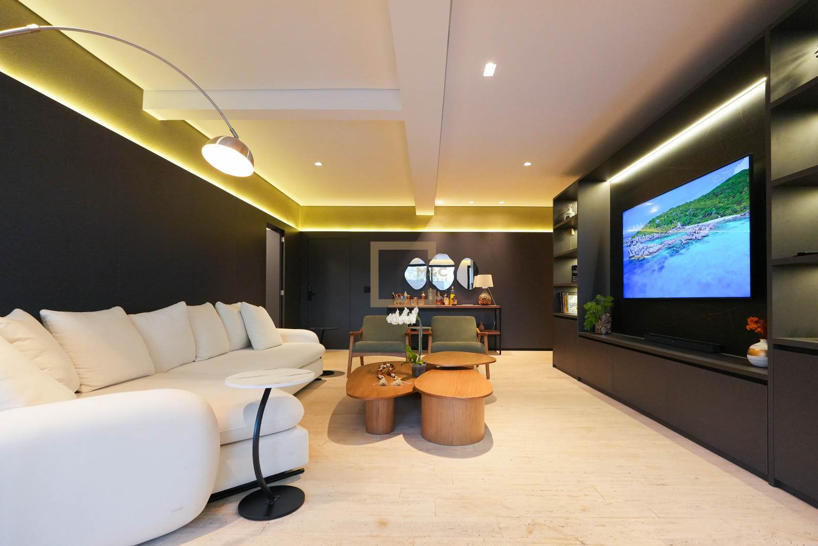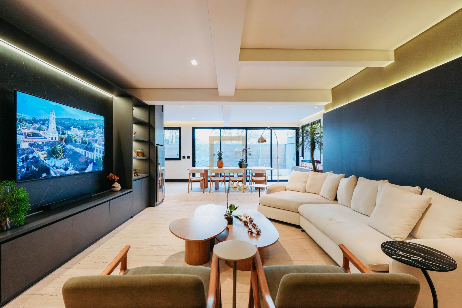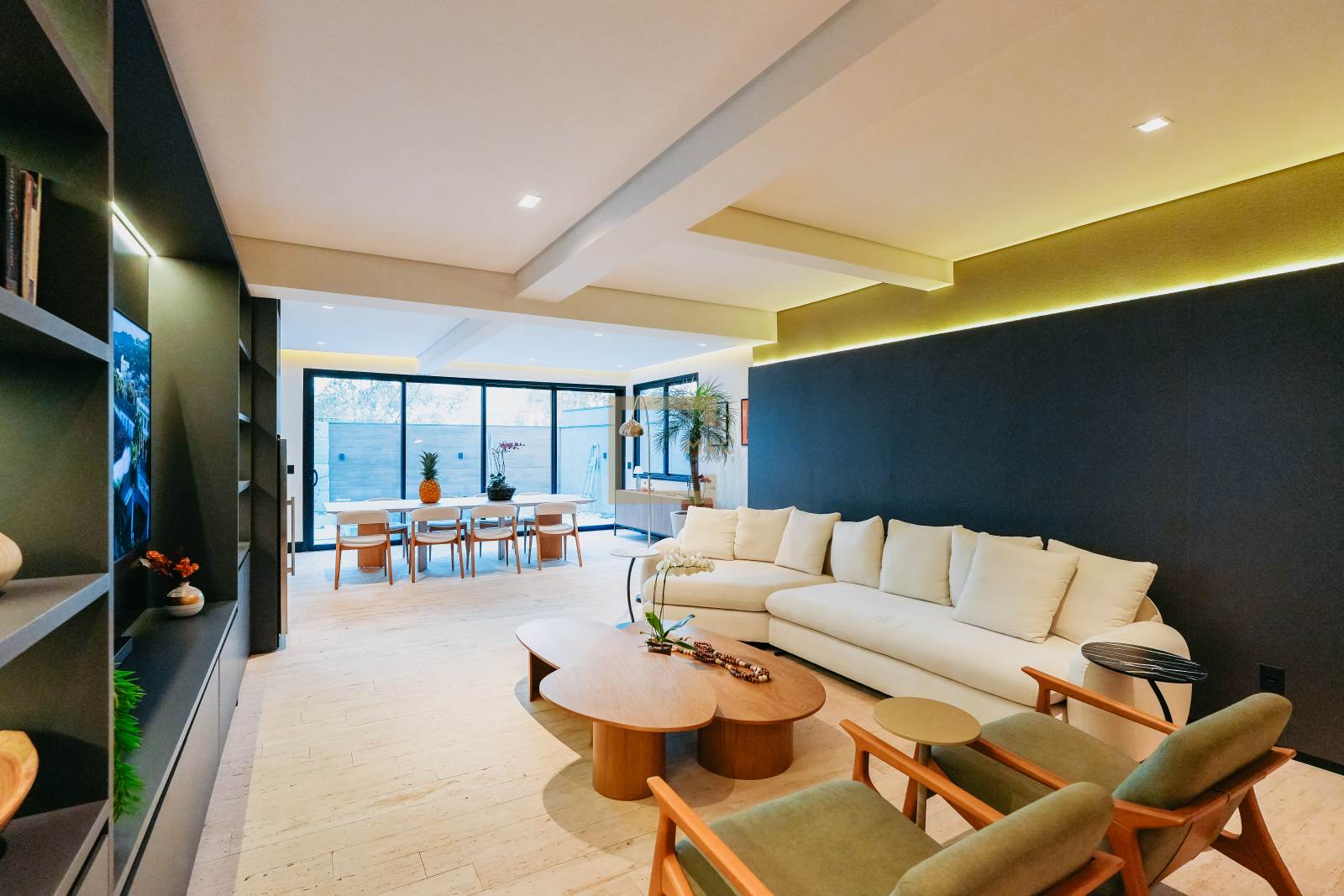 Iluminação quente (2700K) planejada para proporcionar conforto visual e atmosfera acolhedora.
